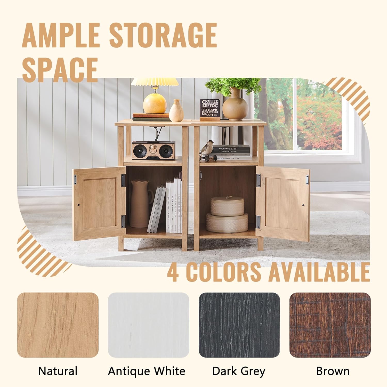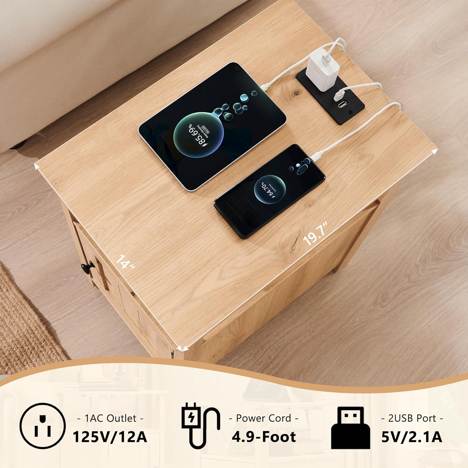 Farmhouse Nightstands Set of 2, Narrow Bedside Table with Charging Station, Night Stand Set 2 with Storage & Open Shelf, End Tables w/Groove Barn Door for Bedroom, Living Room, Natural
