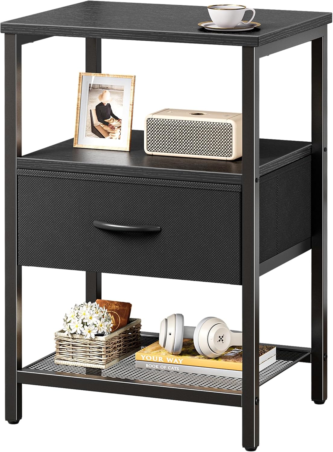 Huuger Nightstand Set of 2, Night Stand with Fabric Drawer, Mesh Shelf, Side Table with Storage, Fabric Drawer Dresser, Open Shelf, Metal Frame, Bedroom, Rustic Brown
