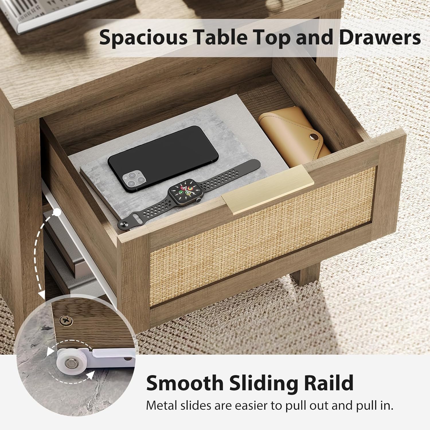 Rattan Nightstand Set 2: Boho End Table with Drawer and Storage Shelf, Farmhouse Cane Accent Bedside Night Stands for Bedroom Small Space Sofa (2, Caramel Oak)