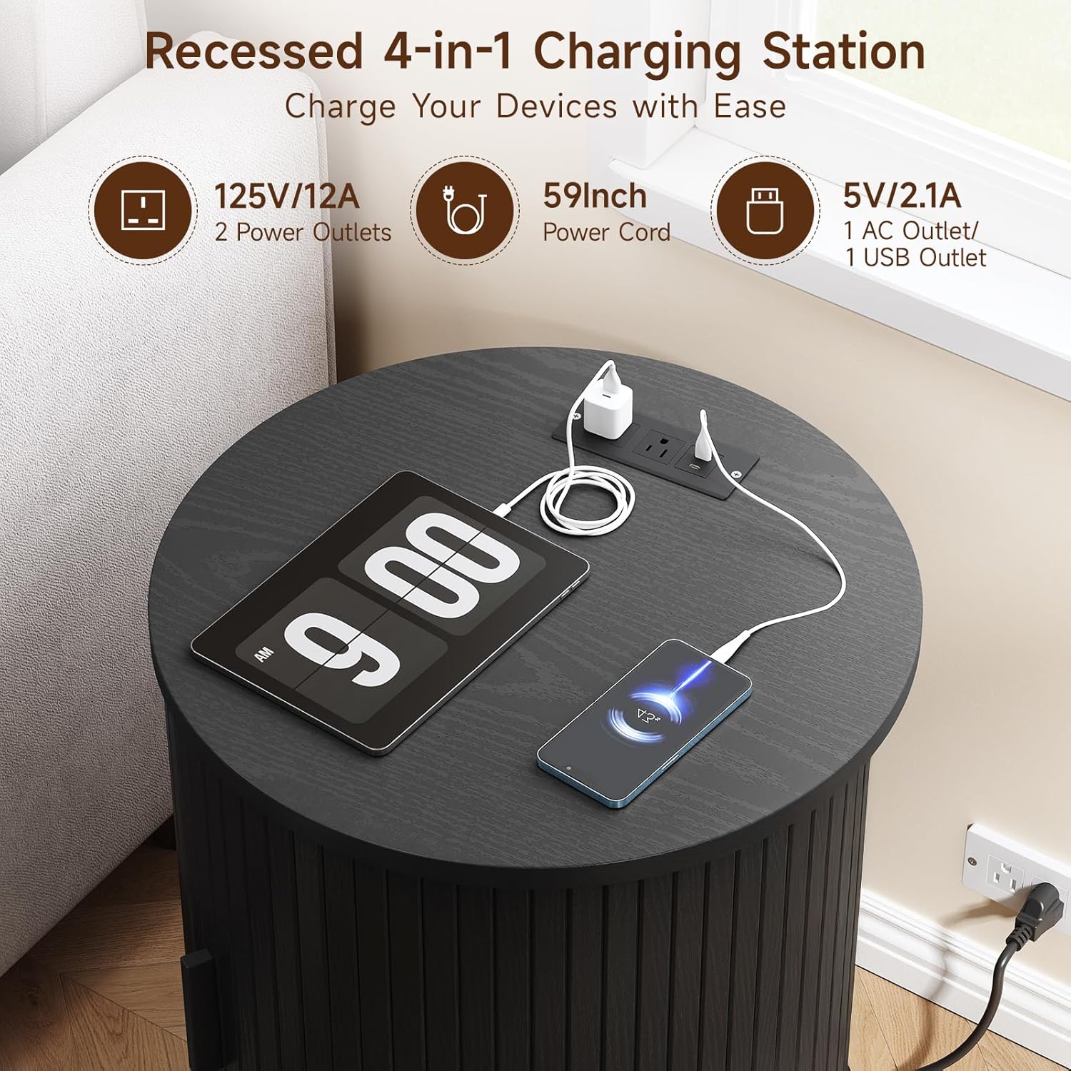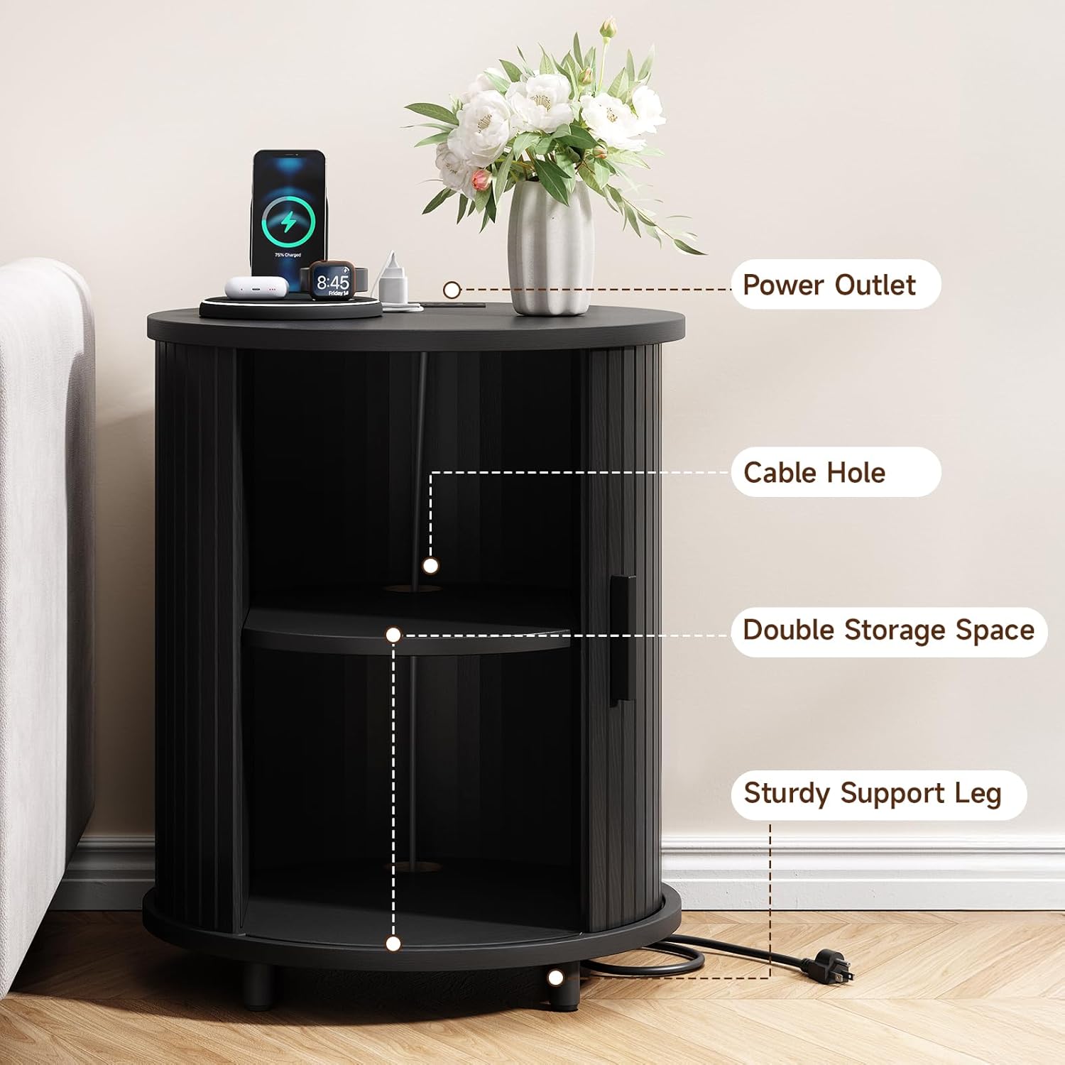Round End Table with Charging Station, Mid Century Bedside Table with Sliding Door & 2 Tier Storage, Modern Nightstand for Living Room, Bedroom, Entryway, Black(1-Pack)