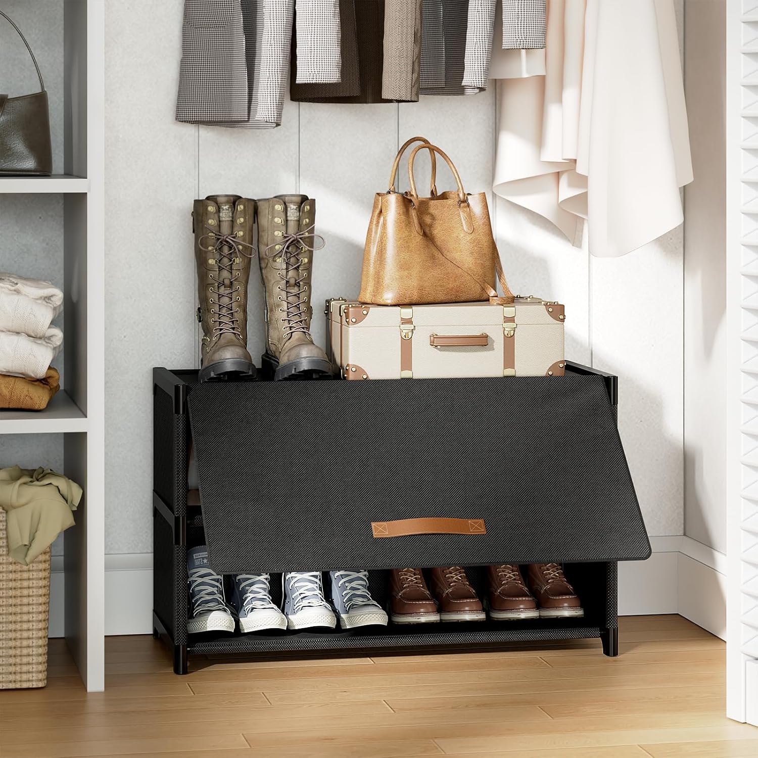 Shoe Rack, 3 Tier Shoe Storage Cabinet with Door 12 Pair Plastic Shoe Shelves Organizer for Closet, Entryway, Hallway, Bedroom, Black